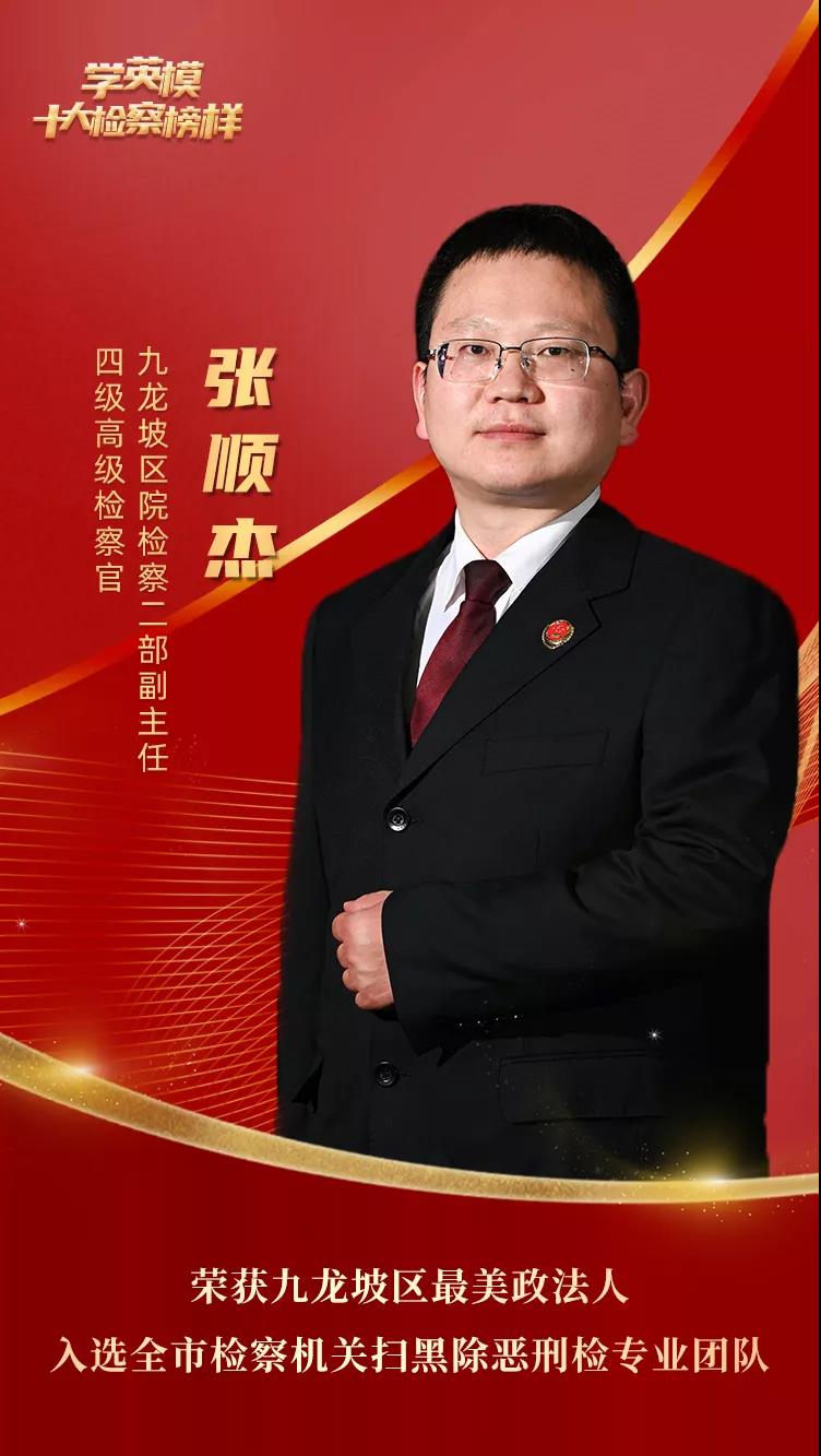 张顺杰,男,九龙坡区检察院检察二部副主任、四级高级检察官。2019年办理案件265件456人,创下所在单位检察官年度办案数量之最,且无一错案。办理的1件案件被市检察院评为“保市场主体、护民营经济”典型案例。荣获九龙坡区最美政法人,入选全市检察机关扫黑除恶刑检专业团队。