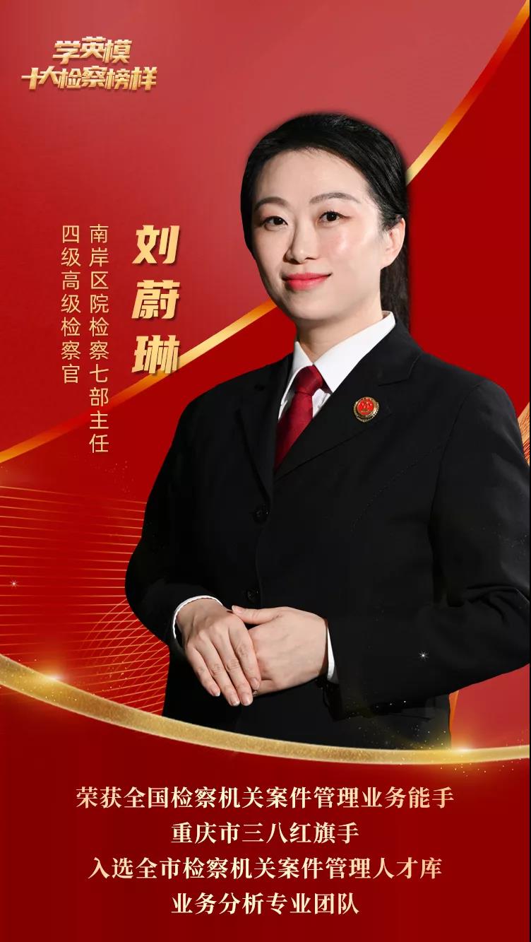 刘蔚琳,女,南岸区检察院检察七部主任、四级高级检察官。率先探索推行律师电子卷宗阅卷制度。参与承担最高检课题2项、市检察院重大课题1项。参与编写最高检《案解民法典》。荣获全国检察机关案件管理业务能手、重庆市三八红旗手,入选全市检察机关案件管理人才库、业务分析专业团队。