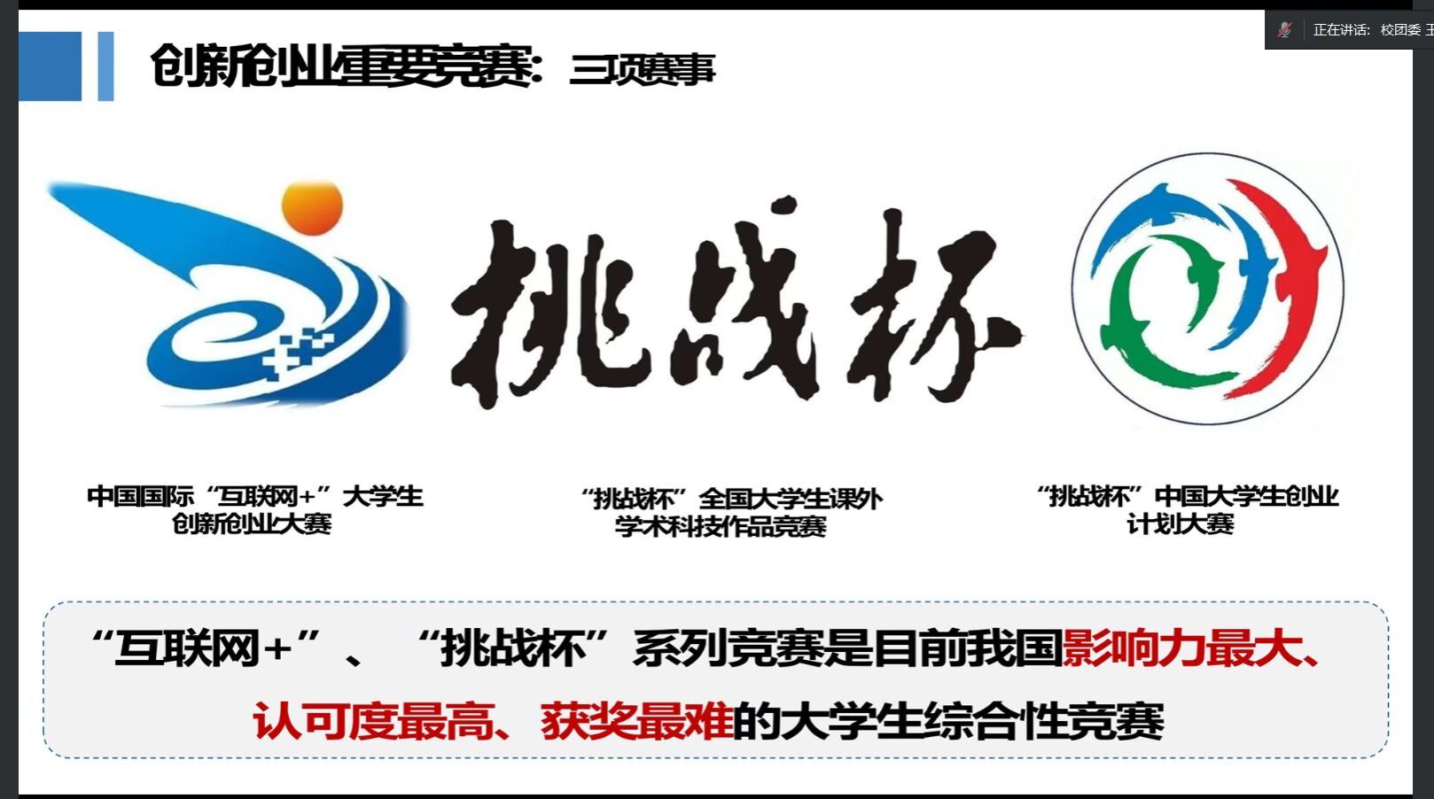 其次,王鹏飞就我国目前影响力最大、认可度最高、获奖最难的两项创新创业竞赛:“互联网+”与“挑战杯”系列竞赛进行了详细讲解,点明了不同赛道间内容上的区别,并从时间维度为同学们梳理了从校赛到省赛、国赛的具体流程。