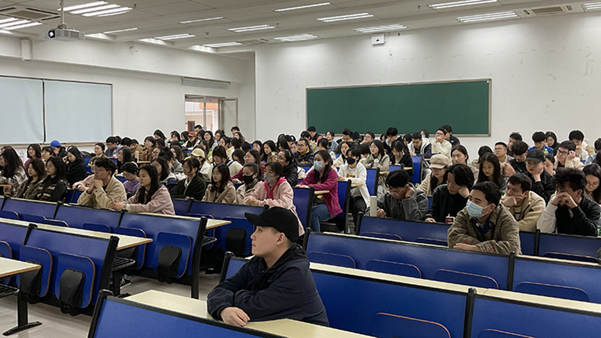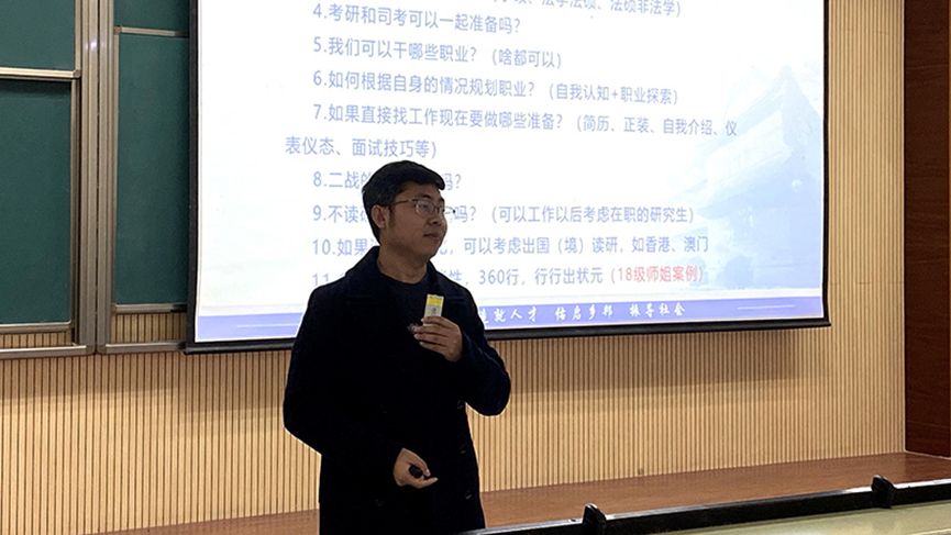 会议伊始,杨志杰以公司近几年的推免、考研、留学、司考通过的数据来引发同学们对自身职业规划的关注。首先,通过对往届数据的分析,杨志杰引导同学们充分信任自身、信任公司,提前根据自己的实际情况做好职业规划。其次,他从同学们重点关注的几项问题入手,在对保研、考研、考公、司考、就业等多项问题逐一讲解的同时,向同学们介绍了职业规划的方法、可能遭遇的困境与破解之道。接着,他用往届学长学姐的现实案例向同学们重点强调自我认知的重要性,希望同学们将职业规划建立在自身性格、特长的分析之上,切忌盲目从众、轻率决定。最后,他再次回归当前就业所面临的多方面艰难形势,用往届成功案例鼓励同学们发掘自身特长、全面发展,不局限自身可能,做多元化的职业规划。