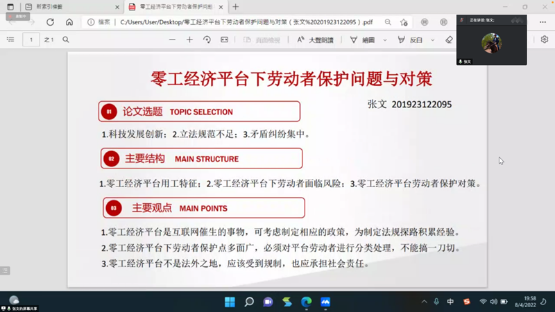 本次活动的第二个环节为学术汇报。学术汇报人张文以《零工经济平台下劳动者保护问题与对策》为题,从零工经济平台用工特征、零工经济平台下劳动者面临风险、零工经济平台劳动者保护对策三个方面说明零工经济平台是互联网催生的事物,可考虑制定相应的政策,为制定法规探路积累经验。学术汇报人蒋兵雷以《论我国环境公益诉讼的原告资格问题》为题,对环境公益诉讼原告资格的概念、特征、理论基础进行了系统阐述,并在总结环境公益诉讼原告资格制度所存在问题的基础上,提出了相应的完善建议。学术汇报人李然以《对“三孩”政策下女性平等就业权的思考》为题,围绕我国全面实施“三孩”的社会背景,从对女性就业权的平等保护目的出发,梳理女性在平等就业权方面的研究现状,总结由于政策措施的不完善导致在就业中遭遇歧视性对待后存在的问题,提出相应的法律对策思考。学术汇报人李文静以《论基因不知情权的构建》为题,先是对基因不知情权的基础概念进行界定,接着对基因不知情权的正当性进行分析,随后从社会、司法实践层面分析构建基因不知情权的必要性和可行性,最后在上述基础上孕育出构建我国基因不知情权的想法。