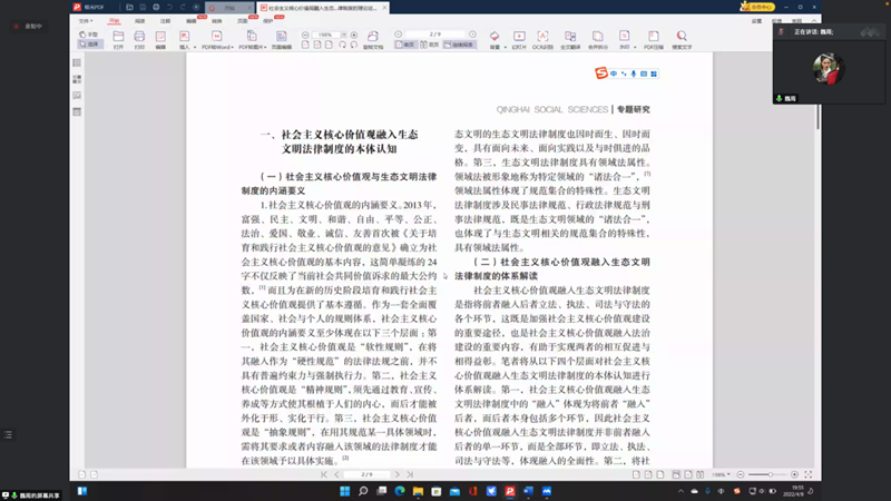 本次活动的第一个环节为嘉宾分享。作为本次学术报告会的特邀嘉宾,研究生二支部党员魏雨结合自身论文写作的心得体会,以《社会主义核心价值观融入生态文明法律制度的理论诠释与立法回应》一文为例,重点讲述了一篇论文如何谋篇布局、如何遣词造句。她强调论文选题要力求有新意,具有研究性。文章摘要需清晰地展现论文的写作思路,避免模糊性的词汇表达。另外,魏雨还给同学们详细介绍了论文关键词选取需要注意避免的雷区、引言的撰写方法、基础理论的选取解读等等。最后,魏雨特别说明了目标指引的重要性,若想成功发表一篇高质量的论文,同学们要尽早行动,坚定信心。