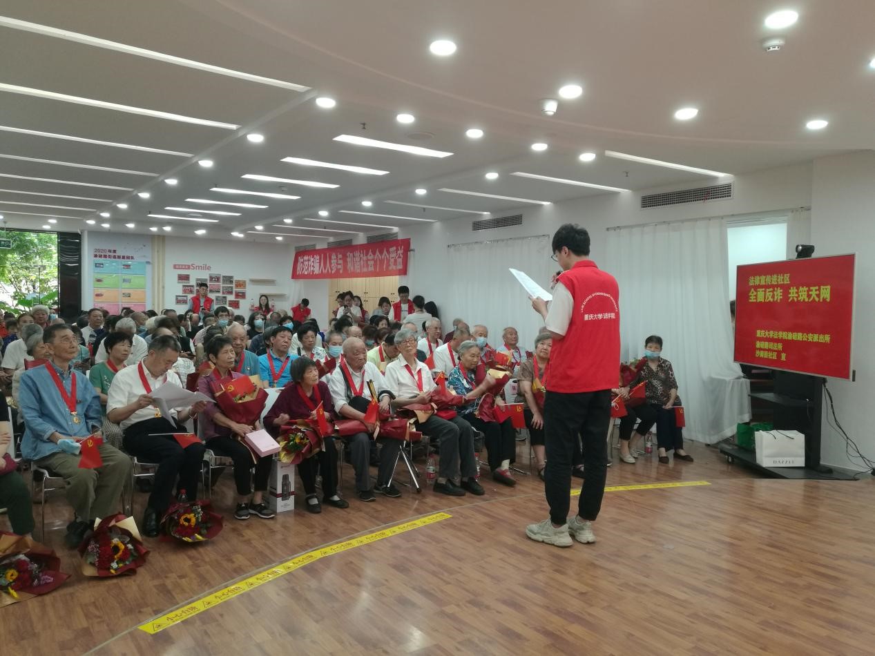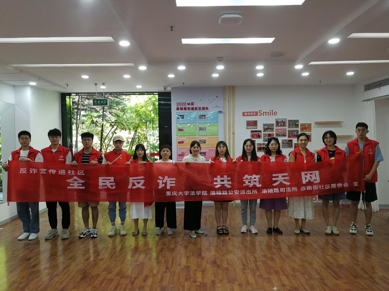 为防范和打击电信网络新型犯罪,切实维护人民群众的切身利益,2021年6月23日,金沙js5588联合渝碚路司法所、渝碚路公安派出所在沙南街社区党群服务站开展以“全民反诈,共筑天网”为主题的普法宣传进社区活动。旨在筑牢社区居民反诈意识,警惕新型诈骗手段,号召全体居民共筑天网反诈“防火墙”,减少诈骗犯罪案件的发生。金沙js5588法律援助中心和研究生三支部的11名志愿者参与了本次普法宣传进社区活动。
