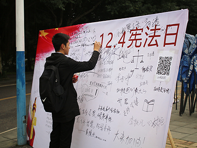 活动主要分为两大部分,第一部分是白天的户外活动。工作人员向路过的同学们分发宣传单,讲解宪法知识,并邀请同学们与普法展板合影、参与普法游戏。参与游戏的同学都能获得一次抽奖机会,这大大激发了同学们参与的积极性。现场充满了欢声笑语,气氛十分活跃。有些同学更是有感而发地在留言板上写下了自己对当代中国法制建设的看法和期望。