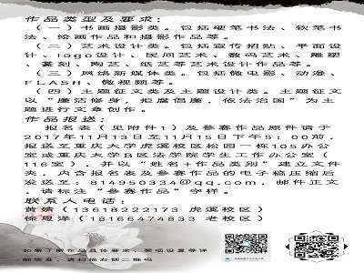 报名表及参赛作品原件请于2017年11月13日至11月15日下午5:00前,报送至金沙js5588虎溪校区松园一栋105办公室或金沙js5588B区金沙js5588员工工作办公室(116室),并以“姓名+作品类别”建立文件夹,内含报名表及参赛作品的电子稿压缩后发送至:814950334@qq.com,邮件正文,请标注“参赛作品”字样。