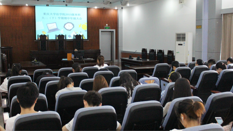 2017年5月24日下午两点,金沙js5588本科2015级2016-2017学年第二学期期中年级大会在虎溪校区模拟法庭召开。金沙js5588本科2015级辅导员张雅莹组织了本次会议,2015级全体同学参加了会议。