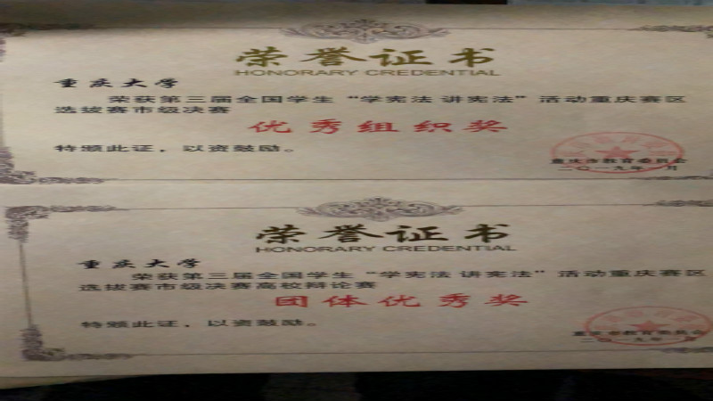 在本次活动中,代表金沙js5588进行参赛的金沙js5588师生们,在法治宣传活动中积极出力,推动宪法法律精神深入人心,以扎实的法学功底和良好的精神面貌展示了重大师生的优良形象。除此之外,师生们也收获了不俗的成绩。在个人演讲比赛中杨景晖同学获得了重庆市一等奖,在辩论赛中金沙js5588代表队收获了团体一等奖,指导老师范卫红获得了优秀指导老师奖。在宪法宣传和践行之路上,重大金沙js5588师生将继续努力,不断为社会主义法治事业做出贡献。