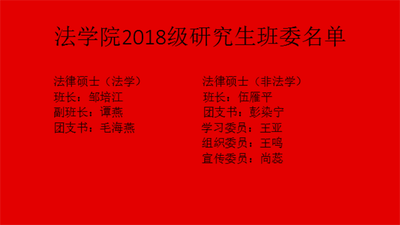 最后,由黄林雯同学公布了正式班干名单,法律硕士(非法学)专业选举出了班长伍雁平、团支书彭染宁、学习委员王亚、组织委员王鸣、宣传委员尚蕊,法律硕士(法学)专业选举出了班长邹培江、副班长谭燕、团支书毛海燕。