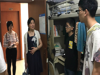 随后,王旭带队抽查了四舍、七舍、八舍的员工情况。在抽查到2014级员工所在的四舍303号和305号宿舍时,委副书记张燕对该年级同学的整体情况做了简单介绍,王旭对同学们普遍具备积极进取的精神面貌表示了高度赞扬。进入宿舍后,王旭与同学们亲切交谈。“平时课程紧张吗?学习是否有困难?经常锻炼身体吗?”“毕业后有什么打算?”“辅导员经常到宿舍看望大家吗?”她鼓励同学们要志存高远、继续深造、相互帮助、共同进步,同时提醒同学要注意身体健康,加强锻炼,努力改善宿舍卫生。