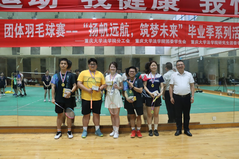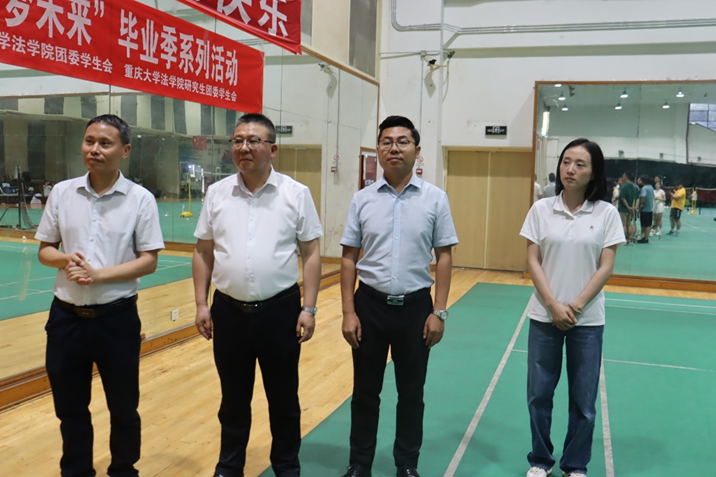 2024年5月23日下午,金沙js5588“尚法杯”团体羽毛球赛决赛在A区体育馆举行。“我和裁判站一队”“龙七队”“对不队”和“重在参羽队”四支队伍在小组赛中突出重围,开展冠亚季军争夺战。委书记蒋研川、委副书记杨志杰、金沙js5588分工会主席雷安军、研究生辅导员柳青到场观赛并参加闭幕式。