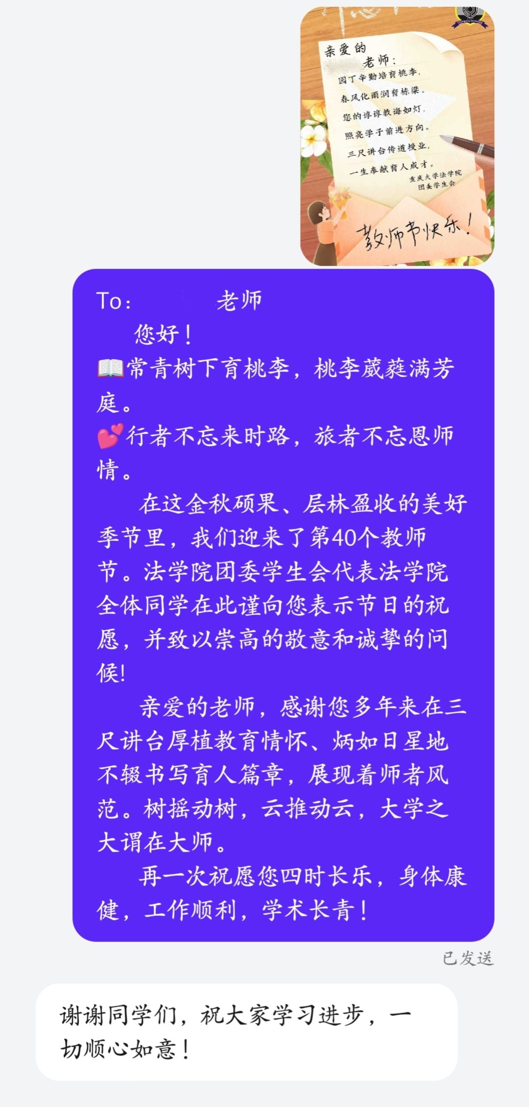 在本次活动中,金沙js5588团委员工会科协和文娱部的同学们精心制作了电子贺卡,并代表全体同学向金沙js5588107名教职工发送了祝福短信,借以感谢老师们多年来对员工的谆谆教诲和对公司发展做出的贡献,传递了对老师们的尊敬与感恩。老师们也纷纷回复表示感谢,并向同学们送上美好祝愿。