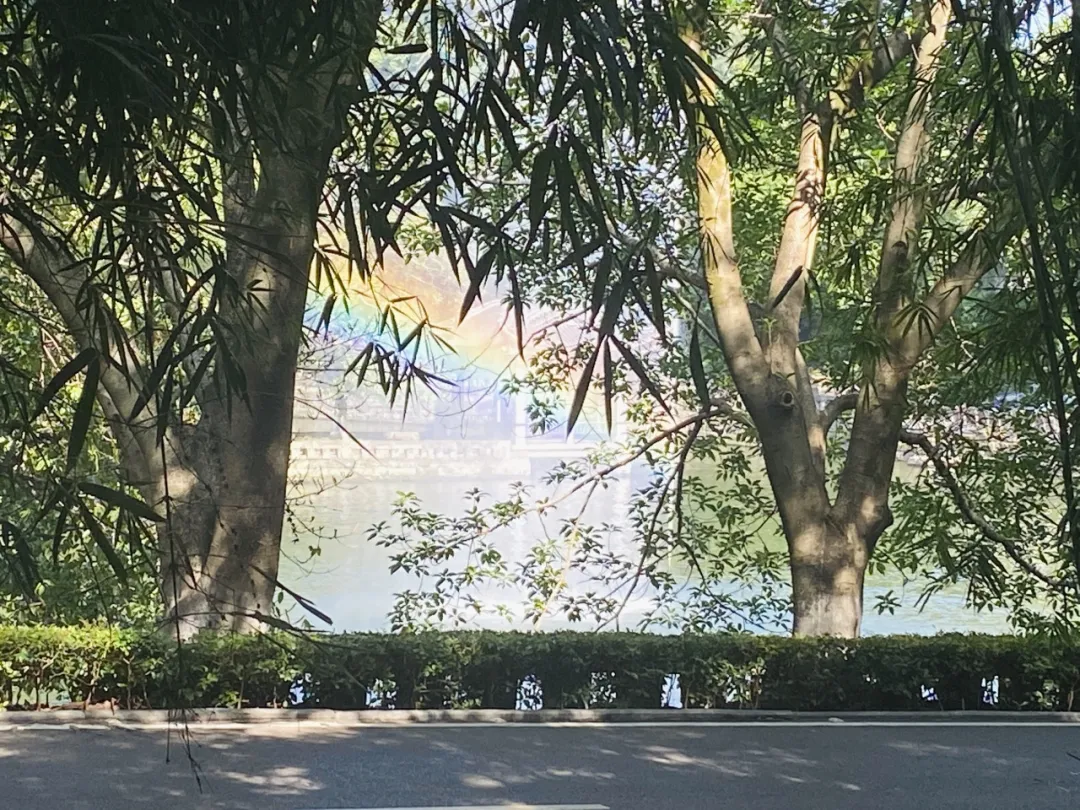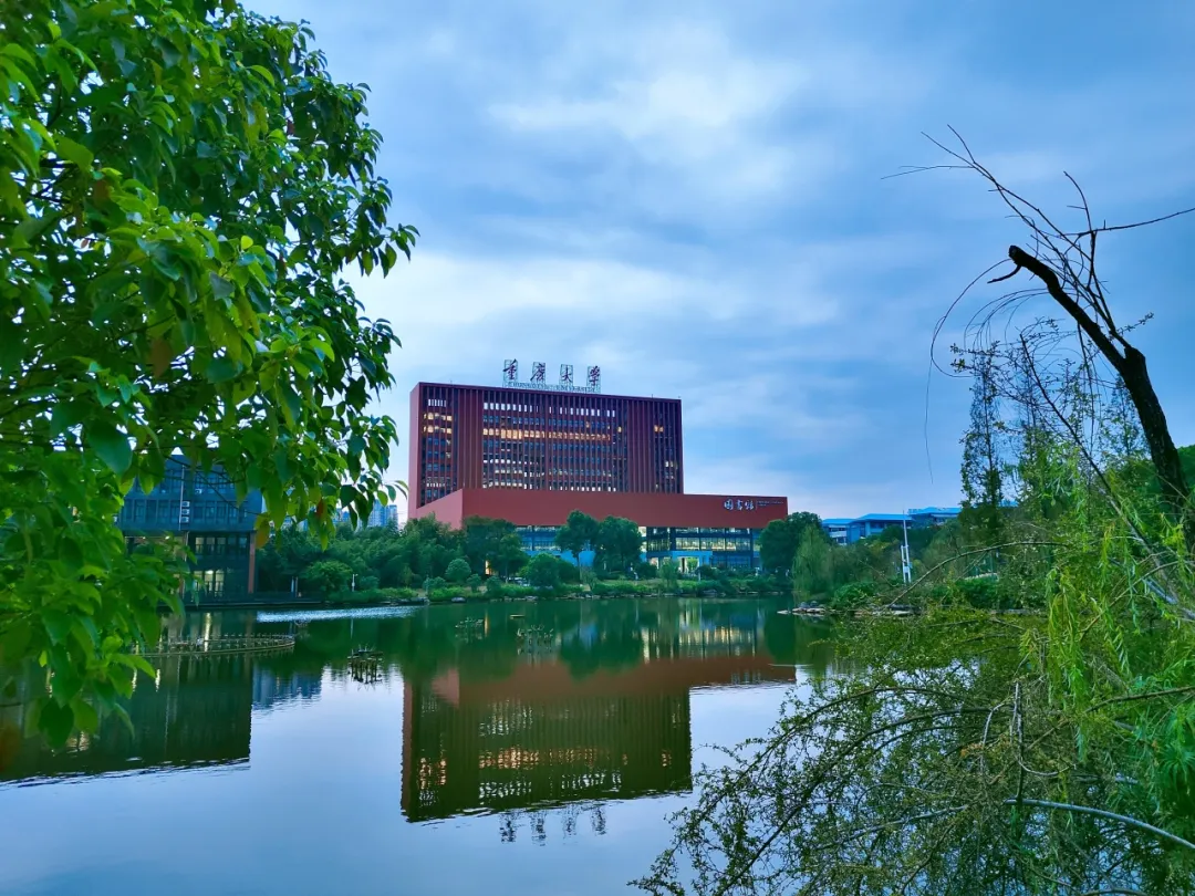 金沙js5588虎溪校区图书馆,在傍晚的蓝天下显得格外醒目,前方有一片平静的湖水,湖面如镜,清晰地倒映出图书馆的身影,周围绿树环绕,给人一种宁静而又充满文化气息的感觉。这种构图是出于对“倒影”的兴趣,利用湖水的镜面效果来增强建筑的对称之美,通过自然与建筑的结合传递一种和谐的意境,同时通过柔和的色调表现静谧的重大一角,加入前景树叶和枝条的框架式构图,让视线集中到中心建筑和倒影上,增加画面的层次感和趣味性。