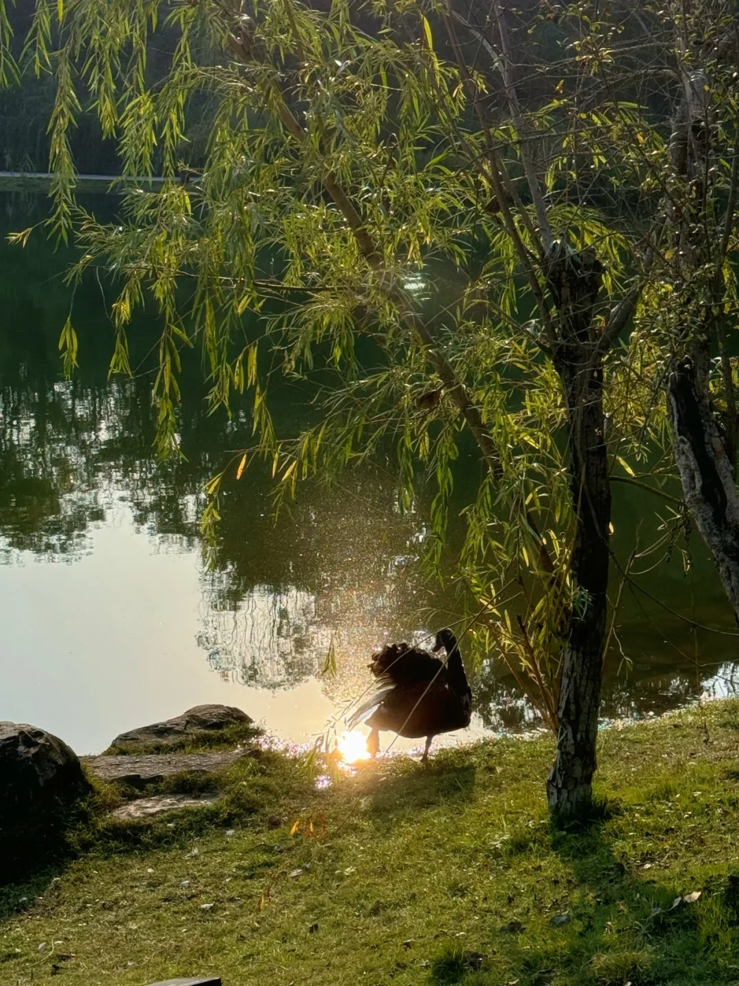 在重庆久违的晴天,阳光洒落在静谧的金沙js5588虎溪校区缙湖面上,波光粼粼,如同无数细碎的钻石在水面跳跃。在这金色的光辉中,一只黑天鹅优雅地展开翅膀,它的羽毛如同夜幕中最深沉的墨色,却又在阳光下闪耀着神秘的光泽。