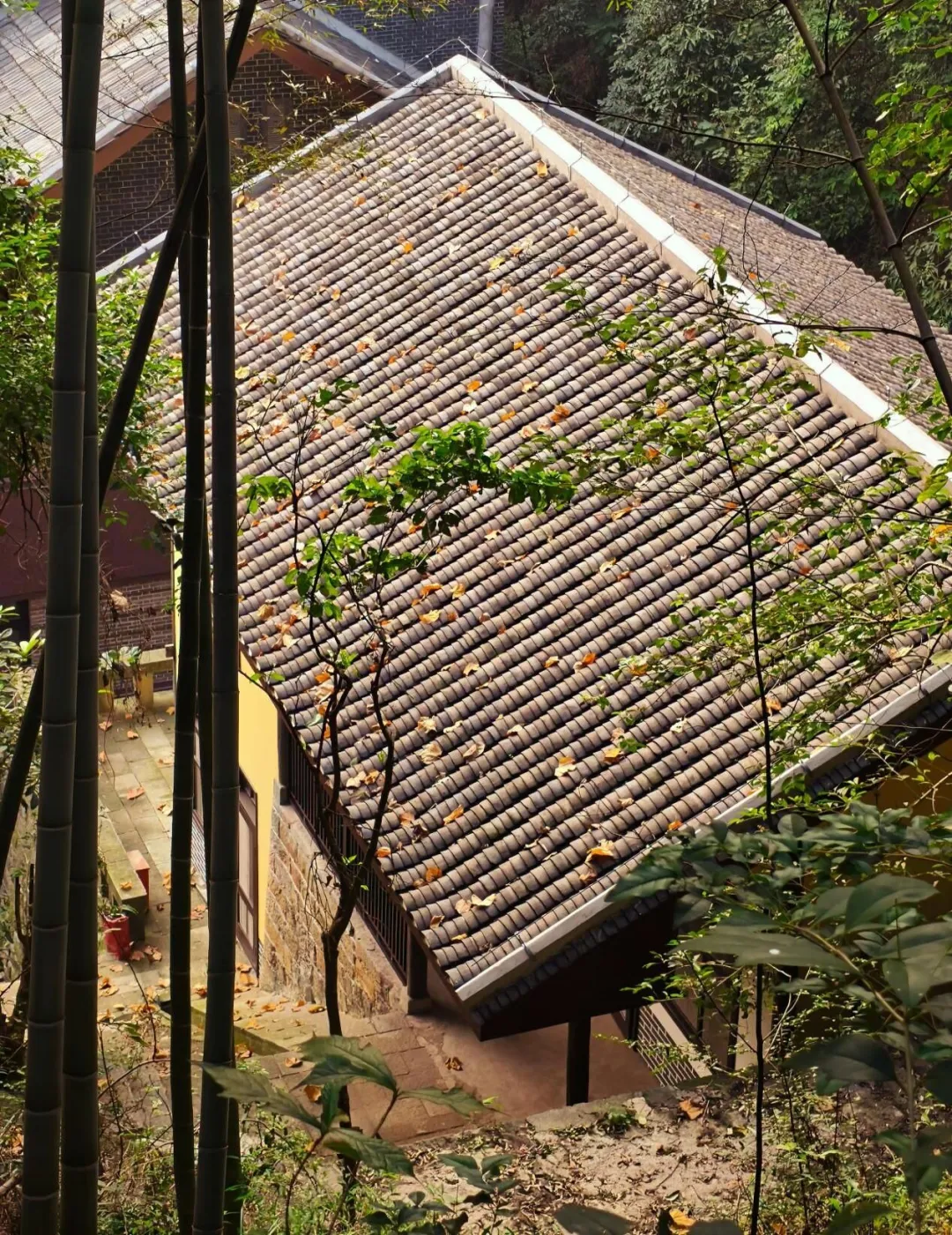 这张照片拍摄于重庆南山抗战遗址博物馆内,展示了一座充满亚洲风格的传统建筑。建筑的屋顶由灰色瓦片覆盖,瓦片上长满了青苔和几片黄色的落叶,岁月的痕迹清晰可见。浅黄色的墙壁、几扇镶嵌在墙上的窗户以及窗户旁肆意生长的绿色植物,共同诉说着这座建筑悠久的历史。建筑前,一条小路蜿蜒而过,两旁是挺拔的竹子和其他绿色植被,为整个场景增添了一抹生机与活力。天空呈现出宁静的蓝色,没有一朵云彩,仿佛时间在这一刻静止了。整个画面给人一种宁静、古老而庄重的感觉,仿佛让人穿越到了那个战火纷飞的年代,感受到了那段历史的厚重与沧桑。