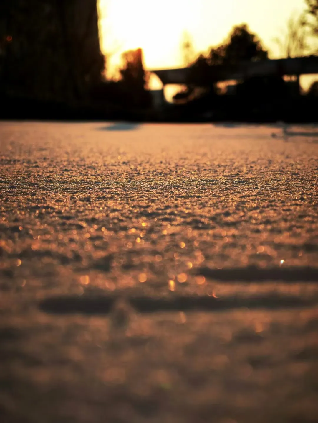 这张照片捕捉到了一个冬日黄昏的美丽瞬间。夕阳的余晖洒在雪地上,雪地上的微光闪烁,仿佛无数颗小小的星星在闪烁,充满了冬日的静谧与浪漫。