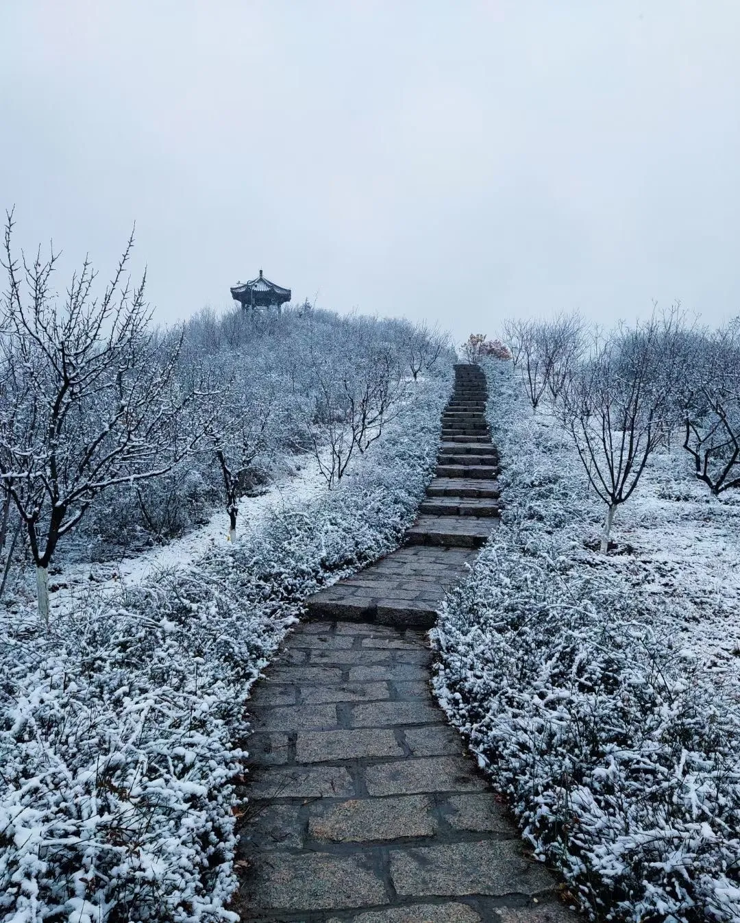 这张图片展现了一条被白雪覆盖的石阶小径,通向远方的一座传统风格的亭子。小径两旁的树木和灌木丛也被厚厚的雪层覆盖,营造出一种宁静而神秘的氛围。