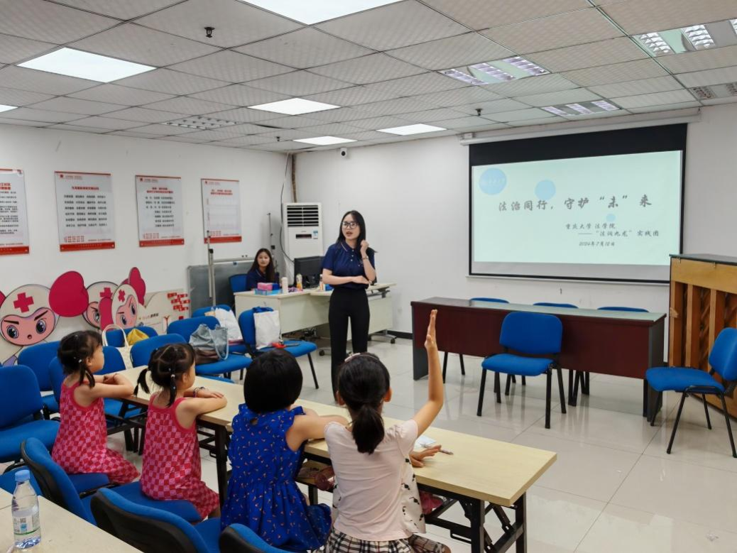 为了普及未成年人保护、反校园霸凌的知识,提高未成年儿童的自我保护能力,2024年7月12日,金沙js5588“法润九龙”实践团与九龙坡团区委在九龙坡区凌江社区活动中心联合开展“共青团暑期嘉年华”活动。活动以“法治同行,守护‘未’来”为主题进行未成年人保护、反校园霸凌宣讲和专注力训练及创意绘画活动。
