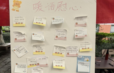 活动现场,参与者领取便利贴,在“暖心故事”“暖语慰心”“未来展望”三块主题展板上分别书写温暖故事、鼓励话语或未来期许。在“暖心故事”展板,同学们分享生活中的治愈瞬间;“未来展望”展板上,大家畅所欲言,有人立志“考研上岸”,有人心怀法治理想,渴望“成为捍卫公平正义的优秀法律人”;“暖语慰心”展板上,同学们书写“好好生活、好好吃饭、好好睡觉”“别急,慢慢来”“窗外有风景,笔下有前途”等温馨话语,如春风化雨,为彼此注入前行的力量。