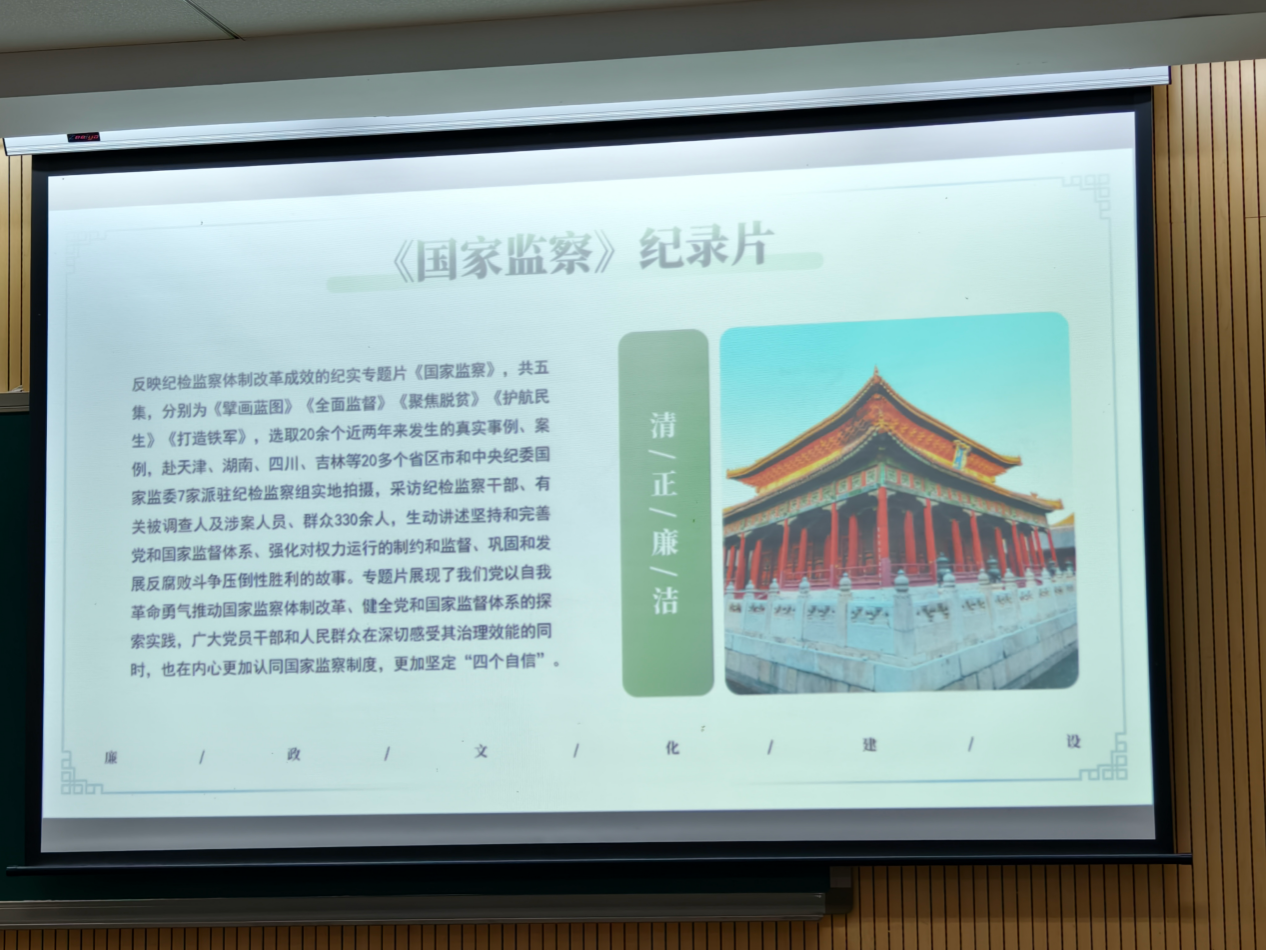 廉洁纪录片——《国家监察》具有很强的警示和教育意义,生动讲述了坚持和完善党和国家监督体系、强化对权力运行的制约和监督、巩固和发展反腐败斗争压倒性胜利的故事。专题片展现了党以自我革命推动国家监察体制改革、健全党和国家监督体系的探索实践。观影过程中,现场气氛庄严肃穆,同学们神情专注,沉浸在影片所营造的警示氛围中。通过观看此纪录片,同学们深刻意识到时刻筑牢思想防线的重要性,广大青年学子更要坚持原则,坚守廉洁底线,抵制诱惑,始终保持头脑清醒。