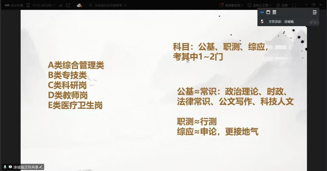 吕淏则从公务员考试全流程出发,系统梳理了备考的关键环节。他以材料准备、行测、申论、面试四大模块为主线,深入分享了自己总结的高效解题方法和应试策略,并为同学们详细梳理了每个环节的备考要点。
