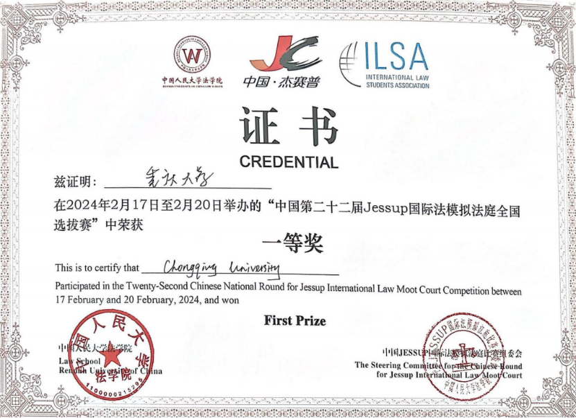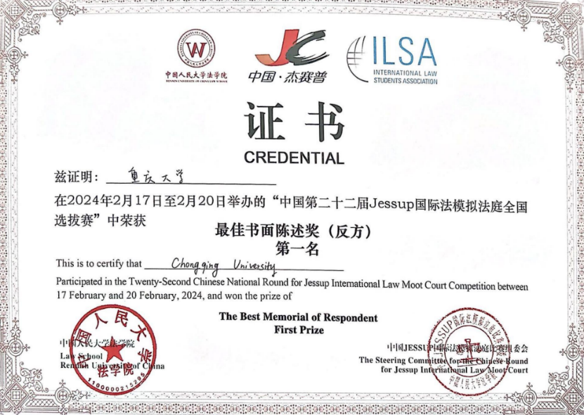 2024年2月17日-19日,中国第二十二届Jessup国际法模拟法庭全国选拔赛(暨第64届“杰赛普国际法模拟法庭竞赛”(The Philip C. Jessup International Law Moot Court Competition)中国赛区比赛)在中国人民大学举行。金沙js5588代表队以四场全胜的成绩挺入八强,最终以总积分第六名获得中国赛区一等奖,成功晋级国际赛。同时,团队成员通过良好的团队合作获得最佳书面陈述奖(反方)第一名。自2019年起,金沙js5588已连续六年斩获全国选拔赛一等奖,成绩斐然。