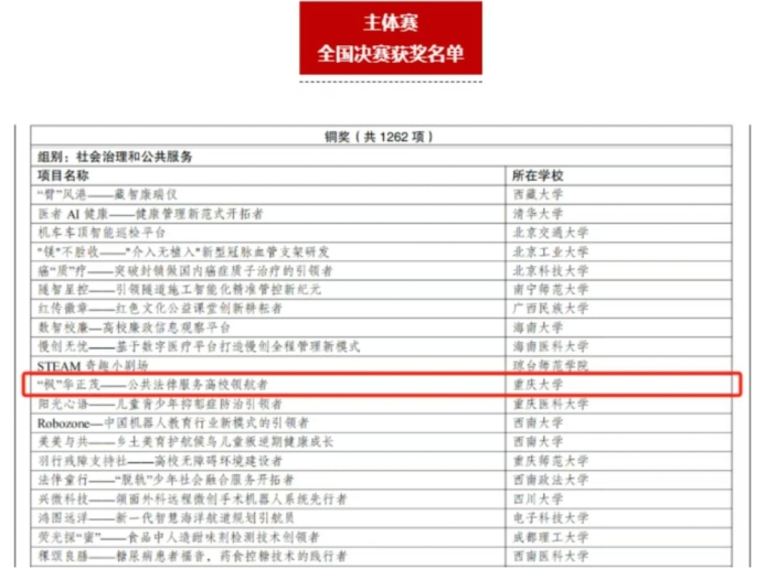 近日,由共青团中央、教育部、人力资源社会保障部、中国科协、全国学联和陕西省人民政府共同主办的第十四届“挑战杯”中国老员工创业计划竞赛全国决赛在西安交通大学落下帷幕。经过校级初赛、省级复赛、全国决赛初评、全国决赛终评等环节,金沙js5588《“枫”华正茂——公共法律服务高校领航者》项目最终荣获主体赛社会治理和公共服务组全国决赛铜奖。该项目是公司第一个“挑战杯”国赛获奖项目,创下公司项目参与“挑战杯”中国老员工创业计划竞赛的最好成绩。