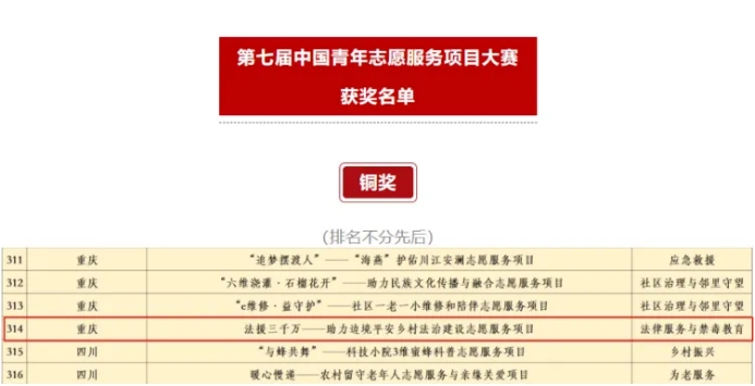 近日,由共青团中央、中央社会工作部、民政部、水利部、文化和旅游部、国家卫生健康委员会、中国残疾人联合会和中共广东省委、广东省人民政府联合主办的第七届中国青年志愿服务项目大赛决赛在广东汕头落下帷幕。金沙js5588《法援三千万——助力边境平安乡村法治建设志愿服务项目》经过激烈角逐荣获全国总决赛铜奖,创下公司项目参与中国青年志愿服务项目大赛的最好成绩。